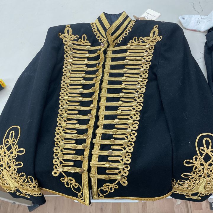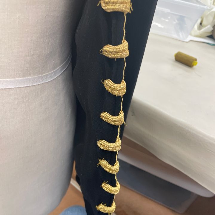 I was also in charge of rigging jackets for a quick change. The entire set up was hand sewn. I closed all of the button holes and reattached the buttons in the proper places. I also added a panel with seven snaps to close the jacket and make the rigging unnoticeable.
